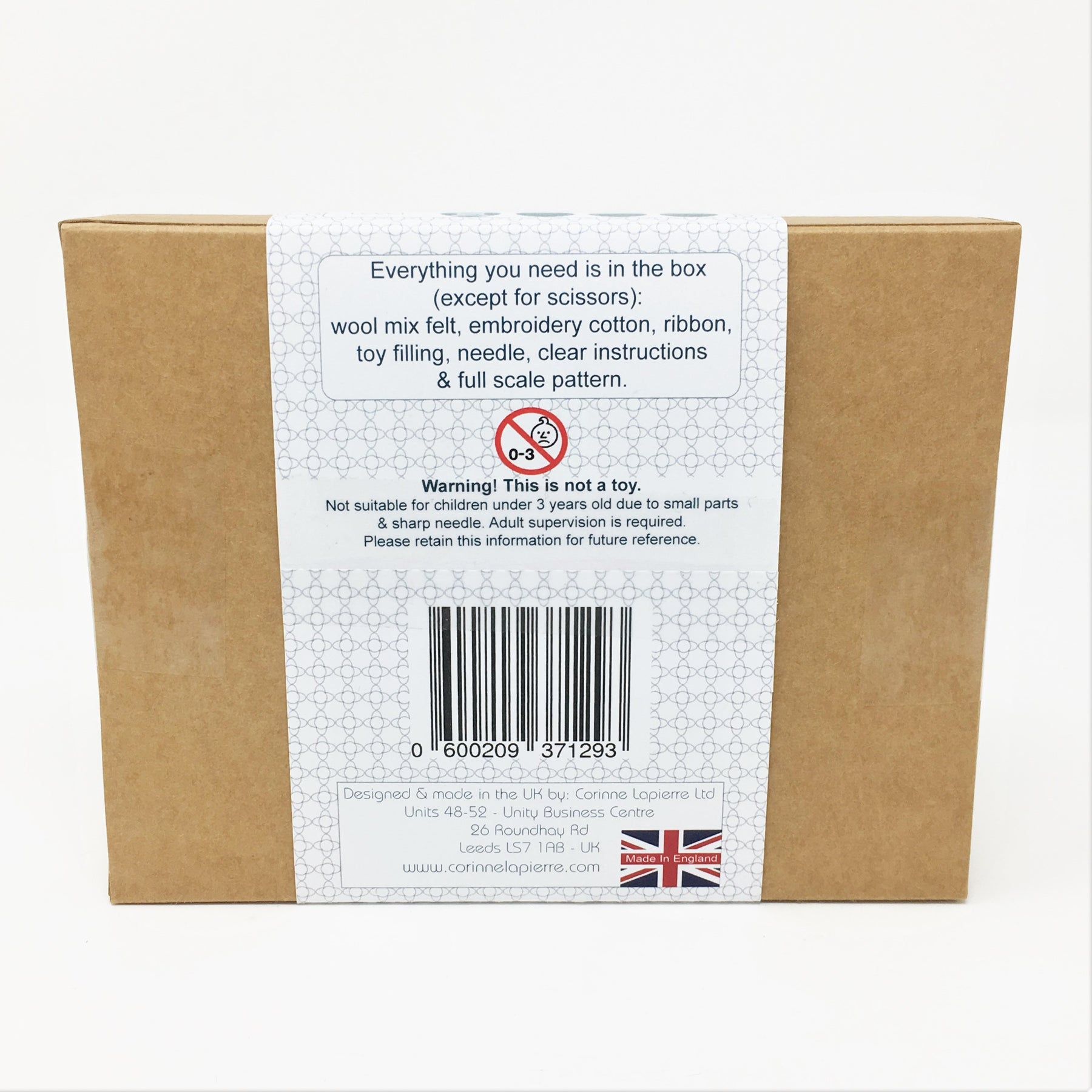 These kits use the best, softest, easiest-to-use wool-mix felt (45% wool, 55% viscose) in distinctive shades that are often hard to find elsewhere. The felt is also very forgiving which makes it a wonderful material to learn sewing and develop embroidery skills.