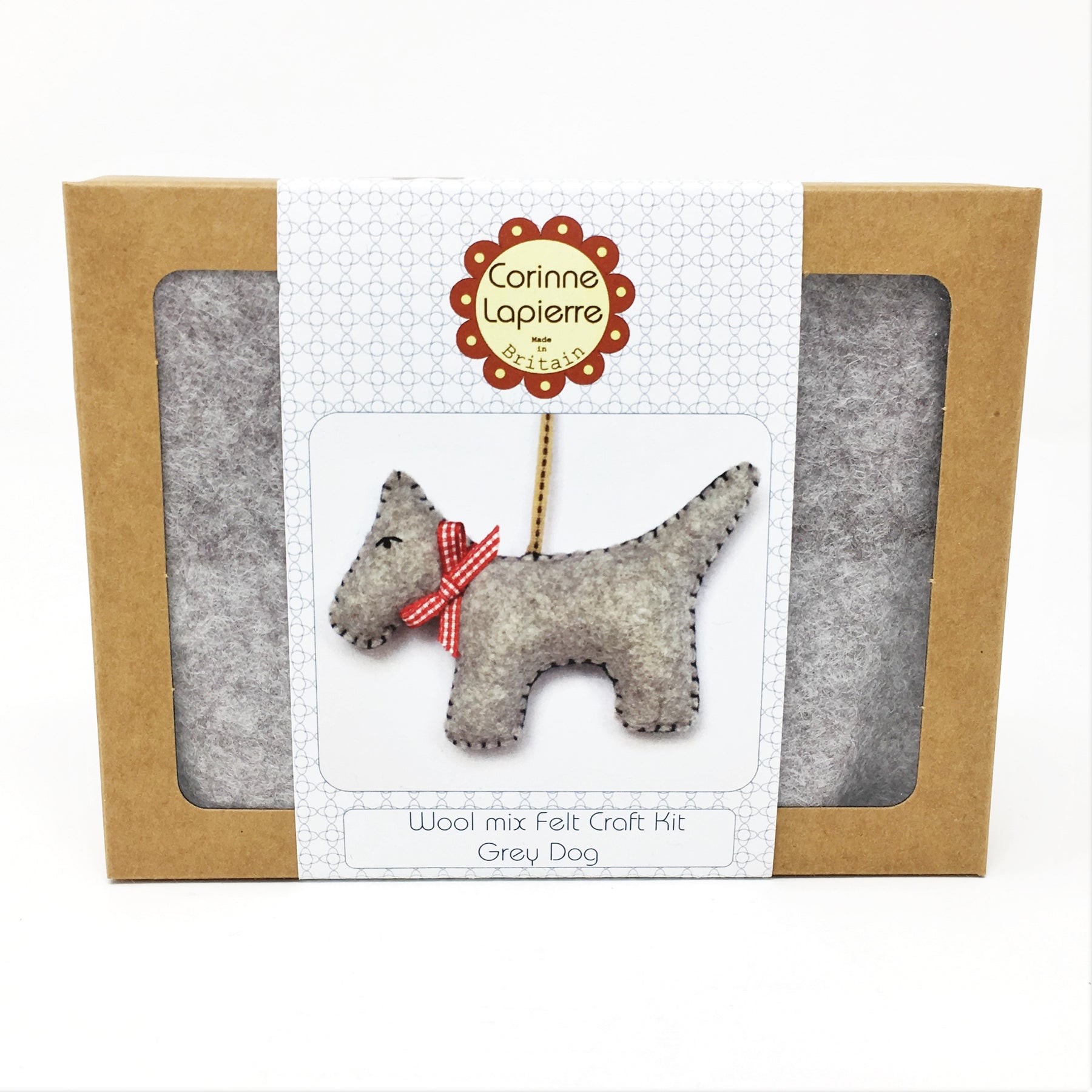 This fabulous sewing kit from Corinne Lapierre, designed and made in the UK contains everything you need to make one adorable grey dog felt hanging decoration with a red gingham bow.