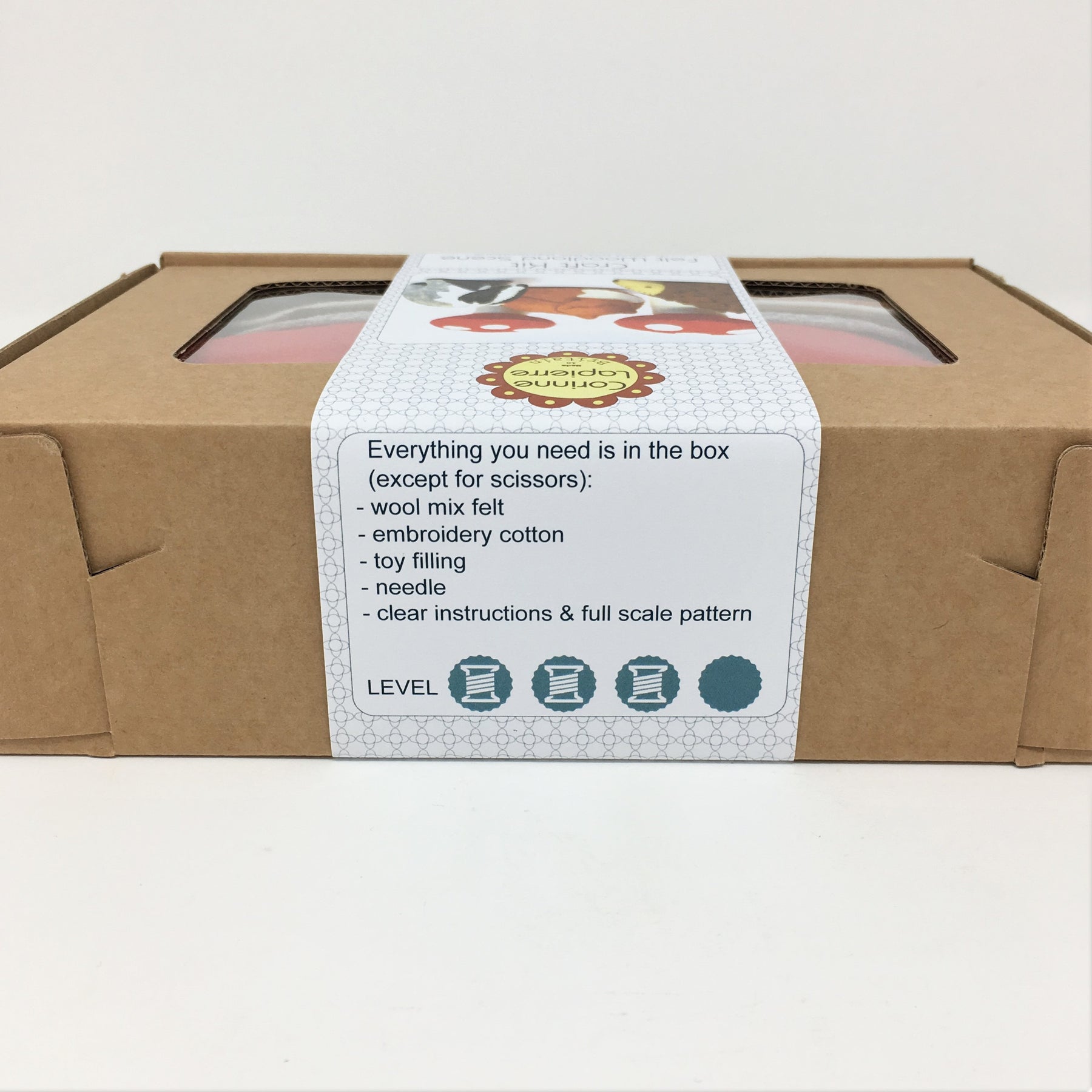 These kits use the best, softest, easiest-to-use wool-mix felt (45% wool, 55% viscose) in distinctive shades that are often hard to find elsewhere. The felt is also very forgiving which makes it a wonderful material to learn sewing and develop embroidery skills.